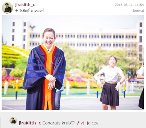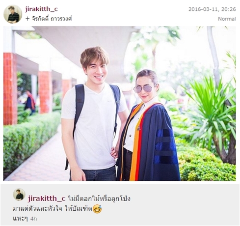 ทางด้านหนุ่ม เมฆ จิรกิตติ์ ก็ได้ตอบกลับ "พี่จ๋า" พร้อมแคปชั่นหยอดว่า "ไม่มีดอกไม้หรือลูกโป่ง มาแต่ตัวและหัวใจ ให้บัณฑิต แหะ ๆ" ทำเอาแฟน ๆ กดไลค์กันรัว ๆ เลย น่ารักจริง ๆ