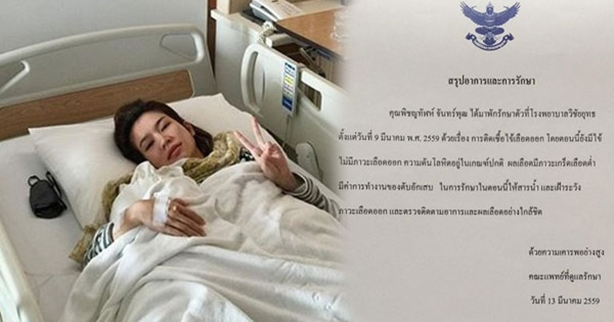 เมื่อวันที่ 13 มีนาคม 2559 แพทย์โรงพยาบาลวิชัยยุทธ ได้ออกแถลงการณ์ สรุปอาการและการรักษา นางสาวพิชญทัฬห์ จันทร์พุฒ หรือน้องไบรท์ ผู้ประกาศข่าวดัง หลังป่วยเป็นไข้เลือดออกและเข้ารับการรักษาตั้งแต่วันที่ 9 มีนาคมที่ผ่านมา โดยระบุว่า ตอนนี้ยังมีไข้ ไม่มีภาวะเลือดออก ความดันโลหิตอยู่ในเกณฑ์ปกติ ผลเลือดมีภาวะเกล็ดเลือดต่ำ มีค่าการทำงานของไตอักเสบ ซึ่งการรักษาต้องให้สารน้ำและเฝ้าระวังภาวะเลือดออก รวมถึงติดตามอาการและผลเลือดอย่างใกล้ชิด
