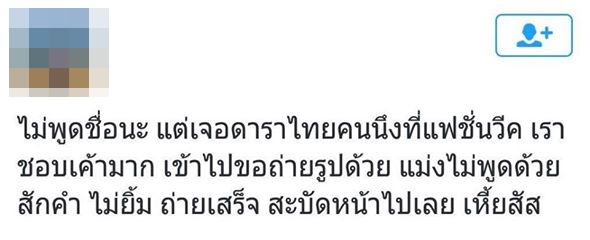 ล่าสุด (24 มีนาคม 2559) มีทวิตเตอร์หนึ่ง ทวีตด่าอย่างระอุบอกว่าตัวเองเป็นแฟนคลับของดาราสาวคนหนึ่ง ซึ่งเมื่อเจอตัวจริงได้เข้าไปขอถ่ายรูปด้วย แต่ดาราสาวคนดังกล่าวกลับไม่พูด ไม่ยิ้ม พอถ่ายเสร็จก็สะบัดหน้าหนีไปเลย อย่างหยาบคาย