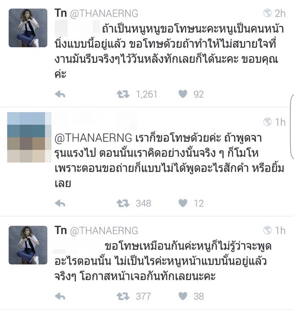 งานนี้ ต้าเหนิง ที่คิดว่าสาวคนดังกล่าวหมายถึงตัวเธอเอง เลยทวีตไปขอโทษ พร้อมบอกว่า ถ้าเป็นหนู หนูขอโทษนะคะ หนูเป็นคนหน้านิ่งแบบนี้อยู่แล้ว ขอโทษด้วยถ้าทำให้ไม่สบายใจ และยังอธิบายว่าที่งานมันรีบจริง ๆ ไว้วันหลังทักได้เลย ขอบคุณค่ะ