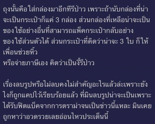 อย่างไรก็ตาม เรื่องนี้ได้ก่อให้เกิดคำถามในโลกออนไลน์ว่า การที่มินซื้อสินค้าแบรนด์ไฮเอนด์อย่างแอร์เมสมากมายถึง 9 ชิ้นขนาดนี้ มินสามารถผ่านศุลกากรมาได้อย่างไร ? และได้มีการชำระเงินให้กับศุลกากรอย่างถูกกฎหมายหรือไม่ ? เนื่องจากราคาสินค้าของแอร์เมสนั้น จากการตรวจสอบพบว่า กระเป๋ารุ่นดังอย่าง Birkin ราคาต่ำสุดที่ขายในยุโรปอยู่ที่ประมาณ 5,900 ยูโร (ประมาณ 2.3 แสนบาท) และราคาจะแพงขึ้นไปเรื่อย ๆ ตามขนาดกระเป๋า, หนังที่ใช้ และรุ่น ซึ่งหากซื้อตัวที่แพงที่สุด ราคาอาจจะแตะครึ่งล้านบาทต่อใบก็ว่าได้