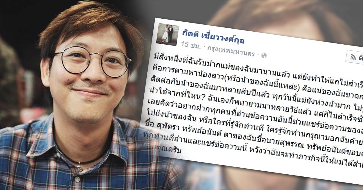 แม่กับน้าไม่ได้ติดต่อกันมาหลายสิบปีแล้ว ทุกวันนี้แม่ยังห่วงน้ามาก ไม่รู้จะหาน้าได้จากที่ไหน ฉันเองก็พยายามมาหลายวิธีแล้ว แต่ก็ไม่สำเร็จสักที เลยคิดว่าอยากฝากทุกคนที่อ่านข้อความอันนี้ช่วยแชร์ข้อความของฉัน ให้ไปถึงน้าของฉัน หรือใครที่รู้จักท่านที ใครรู้จักท่านกรุณาบอกฉันด้วย น้าของฉันชื่อ สุพัตรา ทรัพย์อนันต์ ส่วนตาของฉันชื่อนายสุพรรณ ทรัพย์อนันต์ ขอบคุณทุกท่านที่อ่านและแชร์ข้อความนี้ หวังว่าฉันจะทำภารกิจนี้ให้แม่ได้สำเร็จ ขอบคุณครับ"