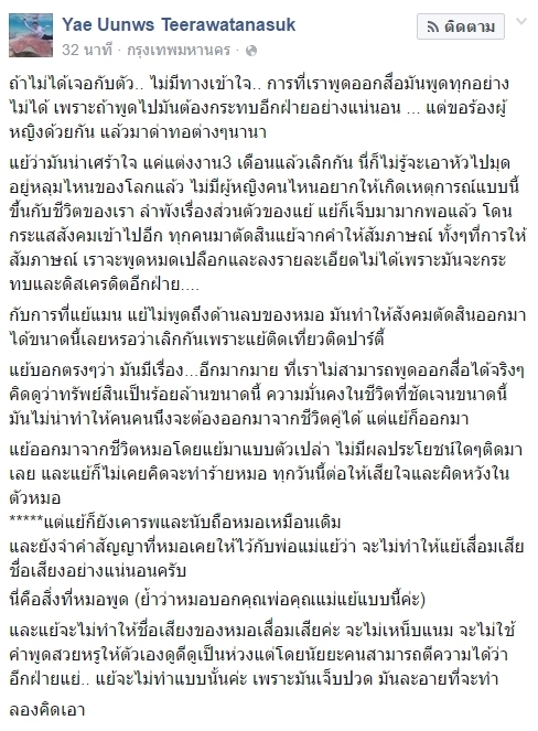 ทุกคนมาตัดสินแย้จากคำให้สัมภาษณ์ ทั้ง ๆ ที่การให้สัมภาษณ์ เราจะพูดหมดเปลือกและลงรายละเอียดไม่ได้เพราะมันจะกระทบและดิสเครดิตอีกฝ่าย....กับการที่แย้แมน แย้ไม่พูดถึงด้านลบของหมอ มันทำให้สังคมตัดสินออกมาได้ขนาดนี้เลยเหรอว่าเลิกกันเพราะแย้ติดเที่ยวติดปาร์ตี้ แย้บอกตรง ๆ ว่า มันมีเรื่อง...อีกมากมาย ที่เราไม่สามารถพูดออกสื่อได้จริง ๆ คิดดูว่าทรัพย์สินเป็นร้อยล้านขนาดนี้ ความมั่นคงในชีวิตที่ชัดเจนขนาดนี้มันไม่น่าทำให้คนคนหนึ่งจะต้องออกมาจากชีวิตคู่ได้แต่แย้ก็ออกมา