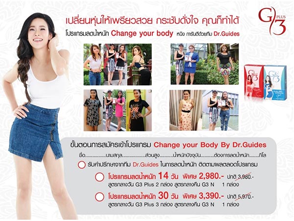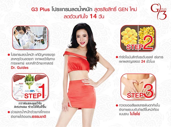 ที่เห็นหุ่นเพรียวอย่างนี้ จริง ๆ แล้วก่อนหน้านี้ มีปัญหาเรื่องอ้วนง่ายมากและที่สำคัญคือปัญหา ไขมันสะสมเฉพาะจุด โดยเฉพาะ หน้าท้อง ต้นแขน ต้นขา ทำทุกอย่างไม่ว่าเรื่องควบคุมอาหาร ออกกำลังกาย แต่ก็ลดยากมากค่ะ จนได้ตัวช่วยดี ๆ ที่คุณหนิง ปณิตา แนะนำผลิตภัณฑ์อาหารเสริมลดน้ำหนัก G3 Plus ชอบตรงที่เป็นโปรแกรมลดน้ำหนัก ที่มีทีมแพทย์ Dr.Guides ดูแลอย่างใกล้ชิด กัญใช้แค่คอร์สเดียวก็เห็นผลเลยค่ะ สัดส่วน เอว สะโพก ต้นแขน ต้นขา ฟิตเฟิร์มกระชับมาก เพราะสารสกัด อาร์ติโชค ใน G3 Plus ช่วยปรับระบบเผาผลาญร่างกายให้ดีขึ้น จึงทำให้ไม่อ้วนง่าย และที่สำคัญยังมีสารสกัดอีกหลายชนิด เช่น แอปเปิล ไซเดอร์ สาหร่ายทะเล ที่มีผลวิจัยว่าสามารถช่วยกำจัดไขมันลึกถึงระดับเซลล์ อย่างไขมันก้อนใหญ่ที่ยากแก่การกำจัด แต่โปรแกรมนี้ช่วยให้ไขมันแตกตัวเป็นโมเลกุลเล็ก ๆ ซึ่งง่ายต่อการกำจัดให้หมดไป และตอนนี้กัญก็ทานต่อเนื่อง เพราะช่วยยับยั้งและป้องกันการเกิดไขมันใหม่ได้อีกด้วยนะคะ ผลที่ได้รับนอกจากรูปร่างฟิตและเฟิร์มกระชับแล้ว ยังทำให้สุขภาพดีไม่กลับมาอ้วนอีก เพียงวันละ 2 เม็ด ก่อนอาหาร และก่อนนอน 1 เม็ด ก็ช่วยลดน้ำหนักไขมันส่วนเกินได้ง่าย ๆ สบาย ๆ ทำให้ชีวิตเราง่ายขึ้นมากจริง ๆ ค่ะ