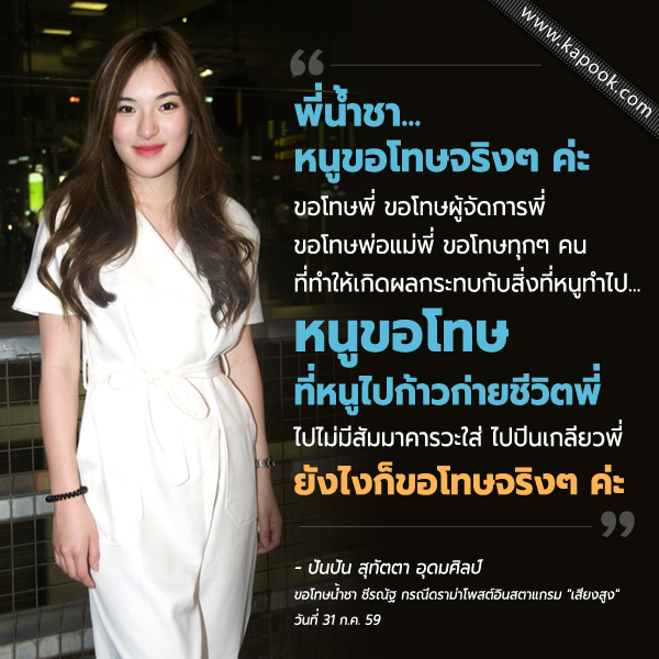 หนูก็ได้โทร. ไปขอโทษพี่น้ำชาแล้ว ขอโทษพ่อแม่พี่เขาด้วย ก็มีการคุยกันแล้ว เขาก็บอกว่าพ่อแม่เขานอนไม่หลับเลย ขอโทษทางค่าย ขอโทษพี่ย้งด้วย หนูรู้สึกผิดกับการกระทำครั้งนี้มาก ๆ หนูโทร. ไปขอโทษพี่เขาแล้ว พี่เขาก็บอกว่าโอเค เขาก็เข้าใจว่าผู้หญิงก็มีฟีลนี้เหมือนกัน ก็คุยกันด้วยดี แต่เขาบอกว่าจะดีกว่านี้ถ้าเราไปขอโทษเขาต่อหน้า ถ้าเราว่างตรงกัน หนูก็ยินดีไปขอโทษเขาต่อหน้า ตอนโทร. ไปก็บอกว่าพี่น้ำชา นี่ปันปันเองนะ หนูขอโทษกับเรื่องที่เกิดขึ้น เขาก็โกรธ แต่เราเข้าใจ เพราะเป็นเรา เราก็โกรธ