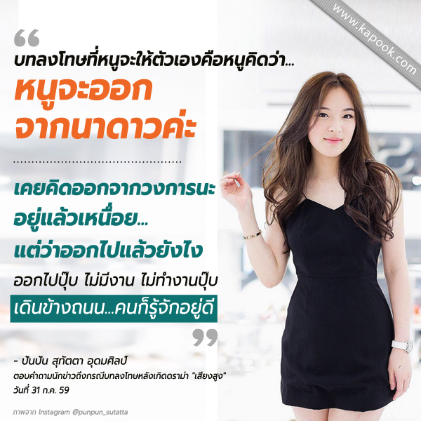 ถึงจุดนี้หนูไปคิดบทลงโทษตัวเองมาแล้ว หนูจะออกจากนาดาวค่ะ เพราะหนูทำให้บริษัทเสียชื่อหลายครั้งแล้วด้วย พี่เขาให้โอกาสหนูมาเยอะแล้ว แต่หนูทำให้เขาผิดหวัง หนูก็ขอออกมาพิจารณาตัวเอง ดูแลตัวเองก่อน ได้คุยกับพ่อแม่กับผู้ใหญ่แล้วว่านี่อาจเป็นทางออกที่ดีที่สุดแล้ว ถามว่าเขารั้งไหม คือเราก็มีงานที่ยังทำด้วยกันอยู่ มีซีรีส์อยู่จะออนแอร์ปลายกันยายนนี้ ถ่ายทำเสร็จหมดแล้ว ถ้าถามว่าเข็ดไหม เข็ดสิคะ ใครจะอยากโดนแบบนี้ คือบทเรียนเราได้ตลอดแหละ สิ่งที่เกิดขึ้นคือแบบคนบางคนผิดพลาดอะ ไม่ได้คิดหน้าคิดหลัง ปันพูดเลยว่าปันผิดเอง
