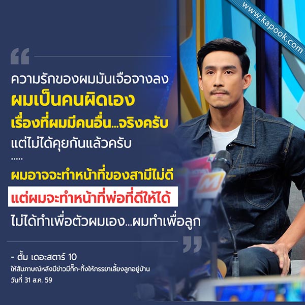 หากถามว่าถ้าเลิกกันลูกจะทำอย่างไรนั้น ตั้ม เดอะสตาร์ 10 กล่าวด้วยเสียงสั่นว่า ตนรักลูกที่สุดและพร้อมจะดูแลลูก แม้ตนจะทำหน้าที่สามีไม่ดีแต่ตนอยากทำหน้าที่พ่อที่ดีให้ได้เพื่อลูก เพราะไม่ว่าอย่างไรลูกก็ต้องการพ่อและแม่แม้ว่าเราจะแยกทางกันอยู่ ซึ่งตนจะทำเต็มที่ให้ลูกรู้สึกไม่ขาดและจะไม่ทิ้งตุ๊กตุ่นกับลูกแน่นอน