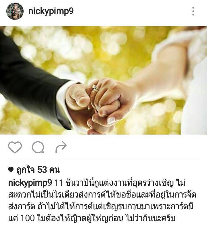 ถึงกับต้องเอามือทาบอก บอกเลยว่าตกใจอย่างแรง สำหรับหนุ่ม นิกกี้ พิ้ม หรือ นิกกี้ 9 นิ้ว เจ้าพ่อแห่งวงการ AV เมืองไทย แถมยังขึ้นชื่อว่าเป็นหนุ่มเพลย์บอยตัวยง ทว่าล่าสุด (10 กันยายน 2559) ก็ทำเอาหลายคนช็อกไปตาม ๆ กัน เมื่อจู่ ๆ หนุ่มนิกกี้ได้โพสต์อินสตาแกรมแจ้งข่าวดีว่า ขอเชิญร่วมงานมงคลสมรสของ นายสุระ ธีระกล และนางสาวศรุดา แพร่สิริกุล ในวันอาทิตย์ที่ 11 ธันวาคม ที่จังหวัดอุดรธานี