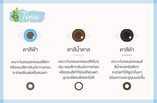 การเลือกสีคอนแทคเลนส์ก็คล้ายกับการเลือกเฉดสีรองพื้นให้เข้ากับสีผิว เพราะถ้าเลือกสีไม่เหมาะกับดวงตา สีผิว สีผม จะทำให้ดูไม่เป็นธรรมชาติ ดูแปลกมากกว่าสวยงาม จอห์นสัน แอนด์ จอห์นสัน (วิชั่นแคร์) จึงมีเคล็ดลับการเลือก "คอนแทคเลนส์สี" ให้ดวงตาของคุณแลดูโดดเด่น มีมิติ และมีชีวิตชีวาอย่างเป็นธรรมชาติมาฝาก