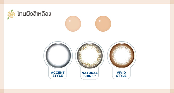 ผิวสีเหลือง/โทนอบอุ่น เช่น ผิวขาวเหลือง ผิวสีน้ำผึ้ง และผิวแทน ซึ่งเป็นผิวส่วนใหญ่ของคนเอเชีย เหมาะกับคอนแทคเลนส์สีอบอุ่น โทนน้ำตาล เทา เช่น Natural Shine ขอบสีเทาเข้มประกายทอง, Vivid Style ขอบสีน้ำตาล ที่ใส่ไปทำงานหรือไปเรียนก็ดูเป็นธรรมชาติ ดูสุภาพแฝงเสน่ห์นิด ๆ อีกด้วย และถ้าอยากเพิ่มเสน่ห์ให้ดวงตาดูกลมโต สดใส มีมิติ ทำให้มีลุคที่ดูมั่นใจ คล่องแคล่ว ควรเลือกใส่คอนแทคเลนส์ขอบสีดำ เช่น Accent Style