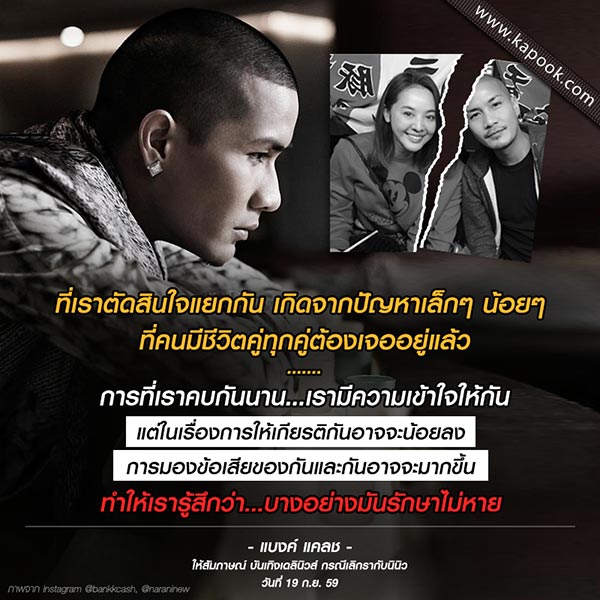ส่วนสาเหตุที่ต้องแยกทางกัน หนุ่มแบงค์ บอกว่า มันเกิดจากปัญหาเล็ก ๆ น้อย ๆ ซึ่งชีวิตคู่ทุกคู่ต้องเจออยู่แล้ว ไม่ใช่ปัญหาใหญ่มาก แต่เราคบกันมา 13 ปี มันก็มีหลาย ๆ ปัญหารวมกัน คบกันมานาน มีความเข้าใจให้กัน ทว่าในอีกมุมหนึ่งการให้เกียรติกันอาจลดน้อยลง มองข้อเสียของกันและกันมากขึ้น จนทำให้รู้สึกว่าบางอย่างมันรักษาไม่หาย ซึ่งเราก็คิดว่าลองแยกกันดูว่าจะเป็นยังไง ถอยคนละก้าว บางครั้งการหันหลังให้กันอาจจะทำให้เราไปเจอสิ่งที่ดีกว่า เป็นการเลิกกันแบบไม่มีใครผิด