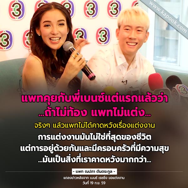 แพท ณปภา : ชื่อลูกก็คุยกันมาตลอด แต่ก็ต้องใช้เวลานิดนึง แต่ยังไม่พร้อมีคนที่สองนะ ขอดูลูกคนแรกก่อน เราถือว่าเราทั้งคู่โชคดีมากที่มีแฟนคลับดี มีคนเข้าใจเราเยอะ เข้าไปอ่านประมาณ 80% คือเข้ามาให้กำลังใจ แต่ก็มีอีก 20% ที่เหลือที่ยังไม่เข้าใจ ก็บอกว่าไม่เป็นไร มีหลายคนพยายามจะขุดขุ้ยพี่เบนซ์เคยแต่งงานมาแล้ว เราก็คิดว่าเขาเก่งมากนะ มีขุดด้วย แต่บอกได้คำเดียวว่า ไม่มีนะคะ