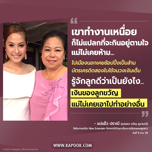 สำหรับประเด็นที่สาวขวัญระบุว่า ตนเองเป็นคนหาเงินใช้เดือนละ 3-4 หมื่นบาทนั้น แม่แอ๊วระบุว่า เป็นความจริง เพราะเมื่อก่อนลูกใช้เงินเก่ง ชอบใช้ของแบรนด์เนมและกินอาหารร้านดัง ซึ่งหากไม่นับเงินเดือนที่ตนวางแผนให้ใช้ ก็ยังมีค่าใช้จ่ายอีกเดือนละอย่างน้อยสามแสน เช่น ค่าทำเล็บ ค่าน้ำหอม กระเป๋า รองเท้า รวมถึงอาหารที่รับประทานบางมื้อถึง 2 หมื่นบาท ซึ่งตนคิดว่าลูกทำงานเหนื่อยก็ไม่แปลกที่จะกินอยู่ตามใจ แม่ไม่เคยห้ามไปเมืองนอก เคยช้อปปิ้งเป็นล้านบัตรเครดิตสองใบใช้จนวงเงินเต็ม รู้จักลูกดีว่าเป็นยังไง เงินของลูกแม่ไม่เคยเอาไปทำอย่างอื่น ตัวลูกเองก็ใช้เงินไม่น้อยแต่เขาทำงานหนักและเป็นเงินของเขา เงินที่เก็บแม่ก็ไม่เคยใช้จ่ายฟุ้งเฟ้อ เพชรเครื่องประดับก็ไม่เคยซื้อหา สินทรัพย์ที่เป็นชื่อแม่ถ้าแม่ตายใครได้อันนี้ก็รู้อยู่แม่จะเอาไปให้ใคร