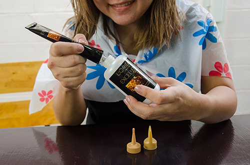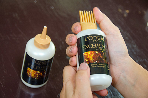 เมื่อชโลมผมด้วยเซรั่มเสร็จแล้ว ทีนี้ก็มาผสม "ครีมเปลี่ยนสีผม" กับ "ครีมดีเวลลอปเปอร์" เข้าด้วยกัน จากนั้นเขย่าขวดเพื่อให้เป็นเนื้อเดียวกันค่ะ