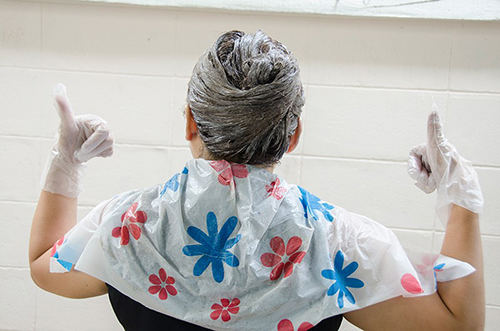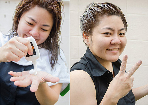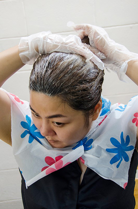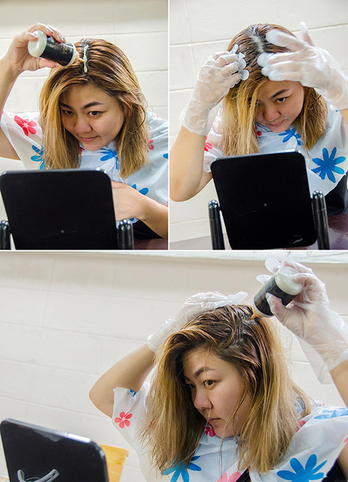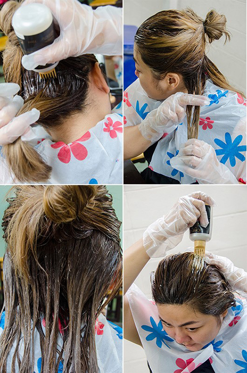 เมื่อลงครีมในส่วนของโคนผมทั่วแล้วก็เปลี่ยนมาใช้หัวแปรงหลายหวีลงครีมให้ทั่วหัวเลยค่ะ โดยเริ่มจากด้านหลังมาก่อน ค่อย ๆ ปล่อยผมทำทีละชั้น ไล่ขึ้นมาเรื่อย ๆ จนทั่วทั้งหัวค่ะ เสร็จแล้วพักทิ้งไว้ประมาณ 30 นาที