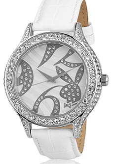นาฬิกาหน้าปัดทรงกลมหรูหราตัดกับความเรียบง่ายของสายหนังสีขาว ใส่แล้วให้ความรู้สึกคลาสสิก แต่ก็แฝงไปด้วยความมีระดับ อีกทั้งหน้าปัดที่ประดับด้วยกลิตเตอร์แวววาวยังช่วยทำให้ข้อมือของคุณดูโดดเด่นมากขึ้นด้วยค่ะ ราคาประมาณ 6,000-7,000 บาท
