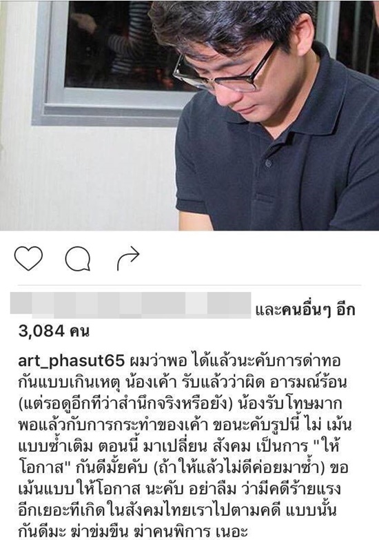 ล่าสุด (9 พฤศจิกายน 2559) อาร์ต พศุตม์ ได้ออกมาแสดงความคิดเห็นถึงกรณีดังกล่าวด้วยว่า ผมว่าพอได้แล้วนะครับ การด่าทอกันแบบเกินเหตุ น้องเค้ารับแล้วว่าผิดอารมณ์ร้อน (แต่รอดูอีกทีว่าสำนึกจริงหรือยัง) น้องรับโทษมากพอแล้ว เปลี่ยนสังคมเป็นการ "ให้โอกาส" กันดีมั้ยครับ (ถ้าให้แล้วไม่ดีค่อยมาซ้ำ) อย่าลืมว่ามีคดีร้ายแรงอีกเยอะที่เกิดในสังคมไทย เราไปตามคดีแบบนั้นกันดีมั้ย