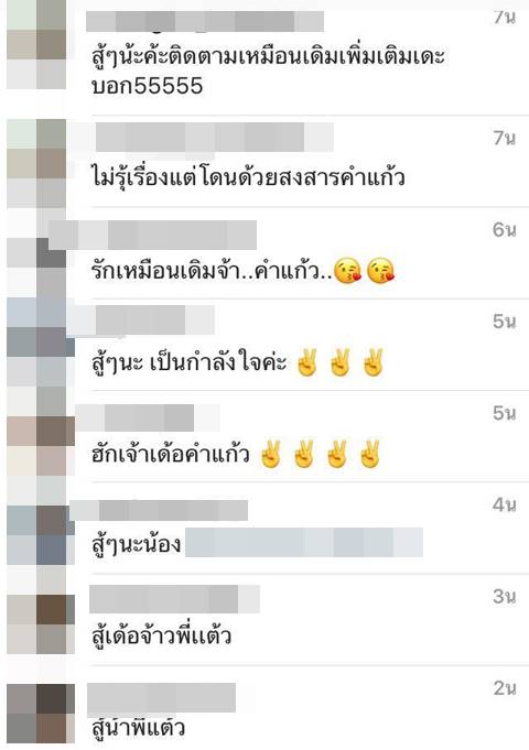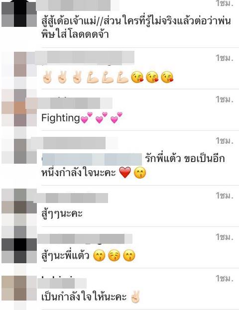 ภายหลังจากที่ แต้ว ณฐพร โพสต์ภาพดังกล่าว ได้มีแฟนคลับเข้ามาคอมเมนต์ให้กำลังใจนางเอกสาวมากมาย โดยบอกให้สาวแต้วสู้ ๆ เป็นห่วงมาก ๆ เลย และจะติดตามผลงานตลอดไป