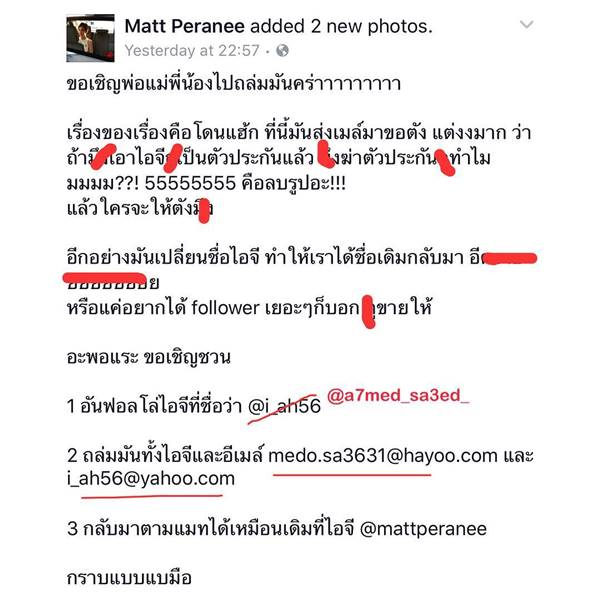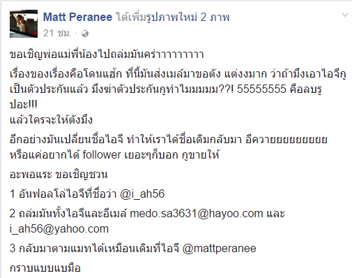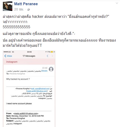 ก่อนจะออกมาอัพเดทว่า แฮกเกอร์ส่งอีเมลมาหาว่า มึงแฮ้กแอคเค้ากูทำหยัง ?"