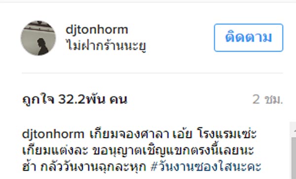 ดีเจต้นหอม ทุ่มสุดตัว คว้าช่อดอกไม้งานแต่ง โบ ธนากร มาครองได้สำเร็จ โพสต์อวดลง IG พร้อมแคปชั่นสุดฮา วันงานขอซองใส ! มาร่วมแสดงความยินดีในงานแต่งเพื่อนรักอย่าง โบ ธนากร กับแฟนสาว พิม พิมพ์ภัคชญา ทั้งที งานนี้ดีเจต้นหอม ก็ขอจัดเต็ม ทุ่มสุดตัวเพื่อช่อดอกไม้ในงานแต่ง เพื่อลุ้นเป็นเจ้าสาวคนต่อไปกับเขาสักที และสุดท้ายเพราะความทุ่มเทเต็มที่ เธอก็สามารถคว้าช่อดอกไม้มาครองได้สำเร็จจริง ๆ