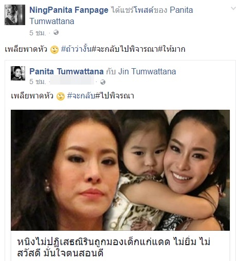 ทำเอาคุณแม่ หนิง ปณิตา ถึงกับเพลีย เมื่อมีบางสำนักข่าวลงข่าวพาดหัวแรงพาดพิงถึง น้องณิริน ลูกสาวสุดที่รักว่า หนิงไม่ปฏิเสธ น้องณิริน แก่แดด ไม่ยิ้ม ไม่สวัสดี จนเจ้าตัวต้องโพสต์ข้อความว่า