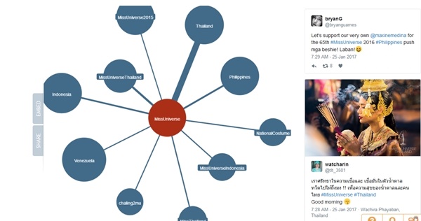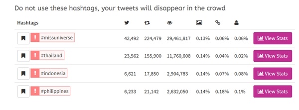 นอกจากนี้ จากการวิเคราะห์ผ่านเว็บไซต์ ritetag.com ซึ่งการติดแฮชแท็ก MissUniverse นั้น ตามมาด้วยแฮชแท็ก #Thailand เป็นอันดับหนึ่ง โดยมีคนทวีตกว่า 23,562 ครั้ง ตามมาด้วย #Indonesia และ #Phlilipines ตามลำดับ