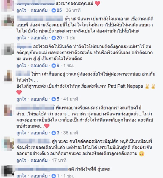 นอกจากนี้ยังมีชาวเน็ตและแฟนคลับจำนวนมากที่เข้ามาให้กำลังใจว่าที่คุณแม่ แพท ณปภา ขอให้เธอผ่านเรื่องนี้ไปให้ได้ และไม่อยากให้เธอต้องเครียด เพราะใกล้จะเป็นคุณแม่เต็มทีแล้ว ...สู้ ๆ นะคะ คุณแม่คนเก่ง^^