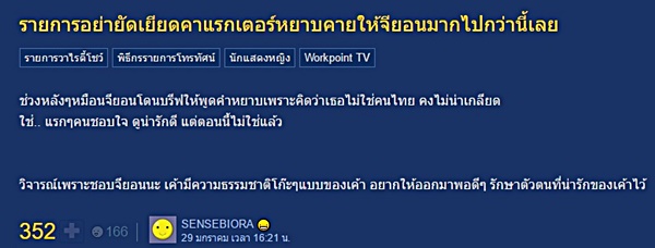 โดยล่าสุด (2 กุมภาพันธ์ 2560) มีสมาชิกพันทิปที่ใช้ชื่อว่า SENSEBIORA ได้ตั้งกระทู้ว่า “รายการอย่ายัดเยียดคาแรกเตอร์หยาบคายให้จียอนมากไปกว่านี้เลย” เพราะดูเหมือนว่าช่วงหลัง จียอนโดนบรีฟให้พูดคำหยาบ เพราะคิดว่าเธอไม่ใช่คนไทย ตอนแรก ๆ อาจจะดูเป็นเรื่องที่น่ารักดี แต่ตอนนี้ไม่น่ารักอีกต่อไป