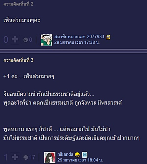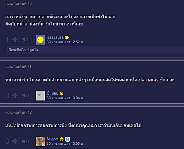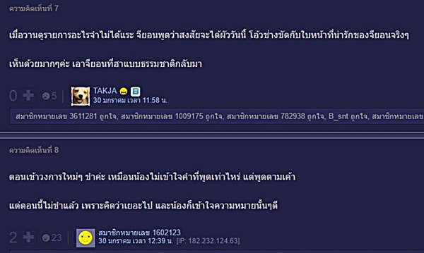 และไม่เพียงเท่านั้น แม้กระทั่งคอมเมนต์ในรายการ ยังมีหลายคนออกมาเตือนจียอนว่า ให้จียอนลดความปากจัดลงไปบ้าง บางเวที บางรายการก็ไม่ควรที่จะหยาบคาย แต่ก่อนอาจจะดูน่ารักดีเพราะจียอนไม่รู้ภาษา แต่ตอนนี้จียอนน่าจะรู้ภาษาไทยมากพอ การพูดแบบนี้ก็ดูไม่น่ารักอีกต่อไป