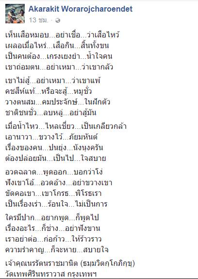 ล่าสุดวันที่ 12 กุมภาพันธ์ 2560 ก็ได้โพสต์ภาพและข้อความผ่านเฟซบุ๊กส่วนตัว Akarakit Worarojcharoendet เผยให้เห็นรถยนต์โตโยต้ารุ่นเก่า พร้อมติดสติกเกอร์ BENZ RACING ซึ่งหนุ่มเบนซ์ยังได้โพสต์ คำสอนของ เจ้าคุณนรรัตนราชมานิต (ธมฺมวิตกฺโกภิกฺขุ) วัดเทพศิรินทราวาส กรุงเทพฯ ดังนี้