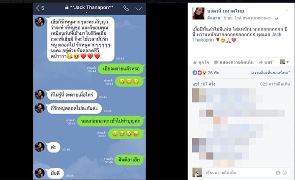 แค่นั้นยังไม่พอ สาวจ๊ะยังได้โพสต์ภาพแชทไลน์สุดหวานที่เป็นการสนทนากันระหว่างหนุ่มแจ๊คและสาวจ๊ะ ที่แจ๊คเองสัญญาว่า จะรักจ๊ะตลอดไป และจะอยู่ด้วยกันตลอดชีวิต