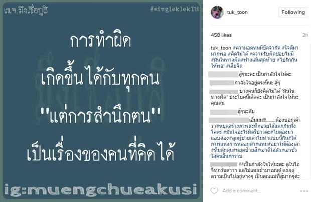 ไม่รู้ว่าเกิดอะไรขึ้น จู่ ๆ สาว ตุ๊กตุ่น รจเลข อดีตภรรยาของหนุ่ม ตั้ม เดอะสตาร์ 10 ก็ขึ้นภาพใน IG แบบเดือดไม่เบา เป็นคำคมว่า "การทำผิด เกิดขึ้นได้กับทุกคน แต่การสำนึกตน เป็นเรื่องของคนที่คิดได้" พร้อมแคปชั่นว่า "#ความอดทนมีขีดจำกัด #ใจดีมามากพอ #คิดไม่ได้ #ความรับผิดชอบไม่มี #มั่นในทางผิด#ฟางเส้นสุดท้าย #ไปรักกันให้พอ! #เสียจิต"