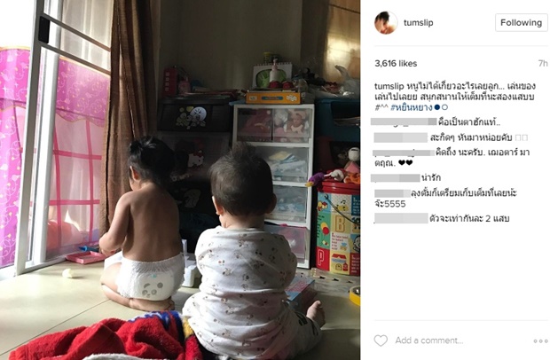 ขณะที่ใน IG ของหนุ่มตั้ม ก็ได้มีการโพสต์ภาพถ่ายของลูก ๆ อยู่เป็นระยะ โดยล่าสุด (16 กุมภาพันธ์ 2560) หนุ่มตั้ม ก็ลงรูปลูกน้อยทั้ง 2 พร้อมข้อความว่า "หนูไม่ได้เกี่ยวอะไรเลยลูก... เล่นของเล่นไปเลยย สนุกสนานให้เต็มที่นะสองแสบบ #^^ #หยินหยาง"