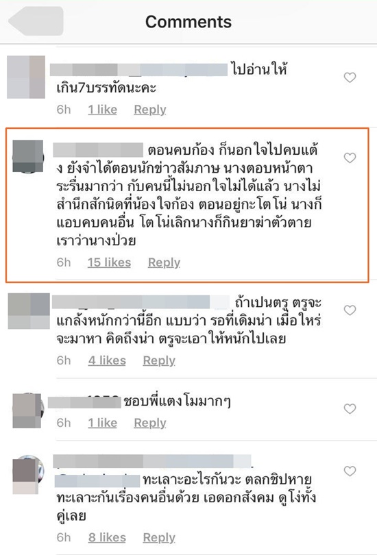 ทั้งนี้ มีคอมเมนต์หนึ่งกล่าวถึงสาวแตงโม โดยโยงไปยังข่าวในอดีตว่า ตอนคบกับ ก้อง กรุณ แตงโมนอกใจไปคยกับแต๊งค์ พงศกร ซ้ำยังให้สัมภาษณ์ด้วยหน้าตาระรื่นว่า กับคนนี้ไม่นอกใจไม่ได้แล้ว คือไม่สำนึกสักนิดที่นอกใจก้อง ขณะที่สาวแตงโม ก็ได้เข้ามาตอบกลับแบบชิล ๆ ว่า "มั่วละค่ะ ตอนคบพี่ก้องยังไม่รู้จักแต๊งค์ 5555555555 หว่ายยยยยย"