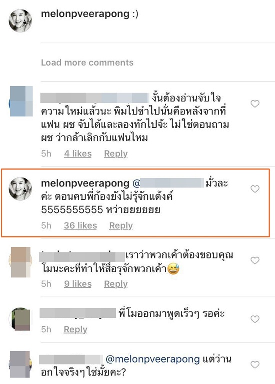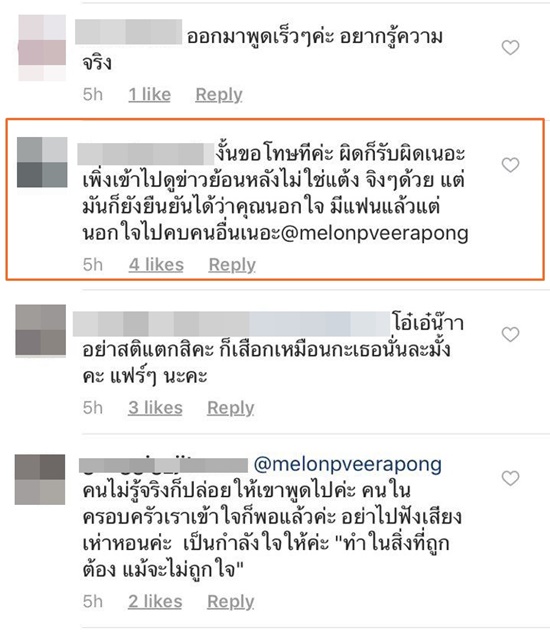 โดยหลังจากสาวแตงโมเข้ามาตอบโต้ เจ้าของคอมเมนต์ก็ได้ออกมาขอโทษแบบแมน ๆ ผิดก็ยอมรับผิด เพิ่งไปดูข่าวย้อนหลังมาว่าไม่ใช่แต๊งค์จริง ๆ แต่มันก็ยังยืนยันได้ว่าแตงโมเคยนอกใจแฟนไปคบกับคนอื่น