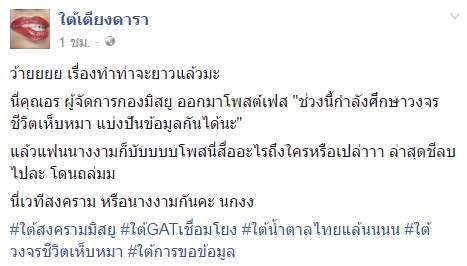 ล่าสุด (12 มีนาคม 2560) ที่เฟซบุ๊กของ คุณออน ชิชญาสุ์ กรรณสูต ผู้จัดการกองประกวด MUT ก็ได้โพสต์สเตตัสว่า "ช่วงนี้กำลังศึกษาวงจรชีวิตเห็บหมา แบ่งปันข้อมูลกันได้นะ" ก่อนโดนถล่มยับ เพราะหลายคนสงสัยว่า ตั้งใจสื่อถึงใครหรือเปล่า ก่อนเจ้าตัวจะลบโพสต์ไป ซึ่งก็มีคนข้องใจว่า ดราม่านี้ยังไม่จบหรือเปล่า ?