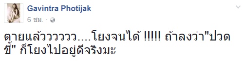 ขณะที่สาว แก้ม กวินตรา ก็ได้โพสต์สเตตัส หลังภาพ "หมากระเป๋า" ของเธอเป็นข่าวว่า "ตายแล้วววววว....โยงจนได้ !!!!! ถ้าลงว่า "ปวดขี้" ก็โยงไปอยู่ดีจริงมะ"