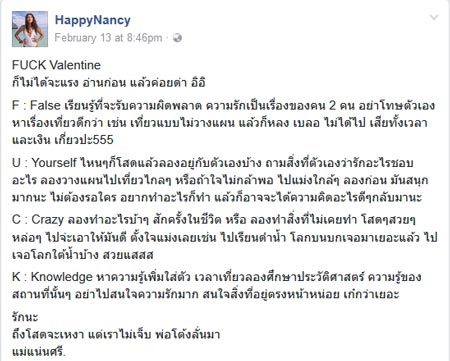 ทำเอาแฟนคลับต่างพากันเสียดายเป็นแถว ๆ สำหรับข่าวการเลิกราของนักร้องหนุ่ม อะตอม ชนกันต์ และแฟนสาวบล็อกเกอร์ท่องเที่ยว แนนซี่ ที่เพิ่งปิดฉากไปเมื่อช่วงวาเลนไทน์ที่ผ่านมาหลังคบหาดูใจกันมากว่า 7 ปี ซึ่งงานนี้ก็ดูท่าว่ารักจะจบลงไม่สวยจนฝ่ายหญิงต้องออกมาโพสต์ข้อความเจ็บจี๊ดว่า "FUCK Valentine" เลยทีเดียว
