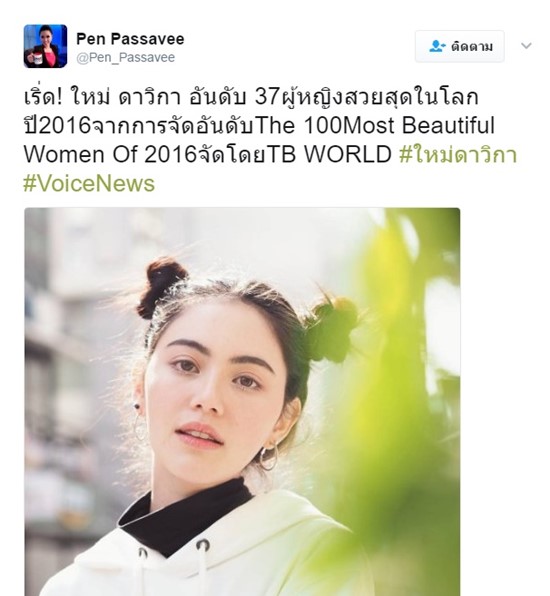 ทั้งนี้ ใหม่ ดาวิกา อยู่ในอันดับที่ 37 และถือเป็นสาวไทยเพียงคนเดียวที่ติดโผผู้หญิงที่สวยที่สุดในโลก