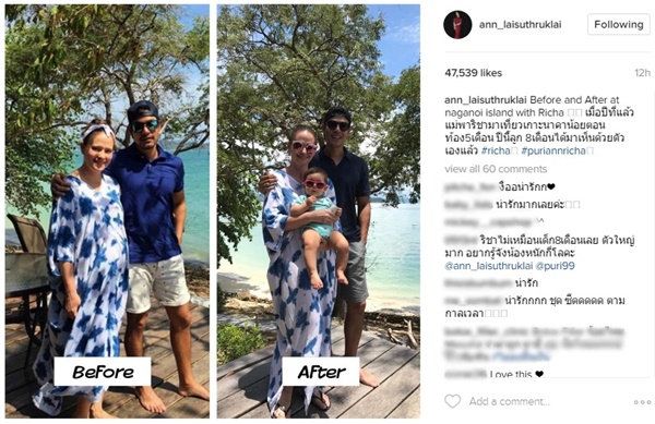 โดยล่าสุด (4 เมษายน 2560) แม่แอน ก็ได้เผยภาพ Before & After เทียบก่อนคลอดและหลังคลอดน้องริชา ณ เกาะนาคาน้อย เคยพาลูกมาตอนอุ้มท้อง 5 เดือน ตอนนี้ลูก 8 เดือน ได้มาเห็นด้วยตัวเองแล้ว น่าชื่นใจจริง ๆ ค่ะ ^^