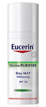 วิธีที่ดีต่อผิวในการช่วยให้ผิวขาวดูกระจ่างใส โดยไม่ทำลายผิวนั้น ควรเลือกใช้ครีมบำรุงที่มีความสามารถในการยับยั้งการทำงานผิดปกติของเมลานิน ซึ่งเป็นตัวการสำคัญของรอยคล้ำและการเกิดจุดด่างดำ และฝ้าแดด และควรเป็นสารที่สกัดจากธรรมชาติเพื่อลดโอกาสการระคายเคืองในชั้นผิว วันนี้ขอแนะนำ Eucerin DermoPurifyer Day Mat Whitening ซึ่งเป็นตัวที่เพิ่งออกมาสู่ตลาด ที่มีคุณสมบัติน่าสนใจมาก ๆ เพราะครีมบำรุงตัวนี้เป็นครีมที่อยู่ในกลุ่มผลิตภัณฑ์ของคนเป็นสิว ที่ช่วยลดสิวอุดตั้นตั้งแต่เชื้อ P. Acnes พร้อมกับมีคุณสมบัติในการช่วยให้ขาวกระจ่างใสได้ด้วย เพราะครีมตัวนี้มีสารสกัดธรรมชาติที่เรียกว่า Natural White Active คือสารสกัดธรรมชาติที่ช่วยให้ผิวดูสว่างกระจ่างใส วิธีการก็คือ เจ้าสารตัวนี้จะเข้าไปช่วยยับยั้งการทำงานผิดปกติของเมลานิน โดยไม่ทำร้ายผิว ไม่ระคายเคืองผิว จึงปลอดภัยสำหรับคนเป็นสิว และมี SPF 30 จึงลดการทำร้ายจากแสงแดดได้อีกด้วย