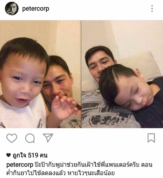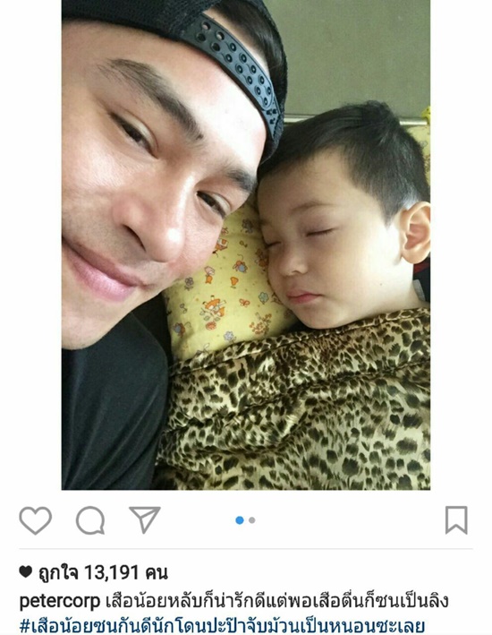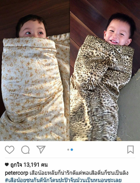 อย่างเมื่อเร็ว ๆ นี้ พ่อปีเตอร์ ก็ได้อัพรูปถ่ายคู่กับลูกชาย และรูปที่ น้องแพนเตอร์ น้องพูม่า โดนผ้าห่มลวดลายสุดเท่พันตัวซะมิด พร้อมแคปชั่นว่า "เสือน้อยหลับก็น่ารักดี แต่พอเสือตื่นก็ซนเป็นลิง #เสือน้อยซนกันดีนักโดนปะป๊าจับม้วนเป็นหนอนซะเลย"