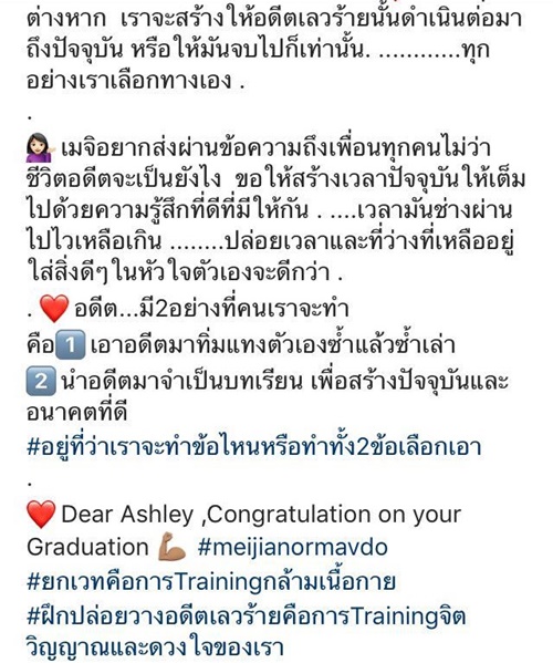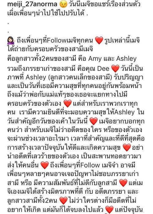 โดยเมจิ เผยว่า รูปเหล่านี้เมจิได้ถ่ายกับครอบครัวของสามีเมจิ คือลูกสาวทั้ง 2 คนของสามี คือ Amy และ Ashley รวมถึงภรรยาเก่าของสามี คือคุณ Dee วันนี้เป็นภาพที่ Ashley (ลูกสาวคนเล็กของสามี) รับปริญญา และเป็นวันที่เธอมีความสุขที่ทุกคนอยู่กันพร้อมหน้า ถึงแม้ว่าพ่อกับแม่แท้ ๆ ของเธอจะแยกทางไปมีครอบครัวของตัวเองแต่สำหรับพวกเราทุกคน เรามีความยินดีที่จะมอบความสุขให้ Ashley ในวันสำคัญอีกวันของเขาในวันนี้ เมจิอยากบอกทุกคนว่า สำหรับเมจิไม่ว่าอดีตของใคร หรือของตัวเองจะผ่านช่วงเวลาอะไรมา เวลาที่สำคัญและที่ดีที่สุดคือ การสร้างเวลาปัจจุบันให้ดีและเกิดความสุข อย่านำอดีตที่เลวร้ายของตัวเอง เป็นสะพานทอดยาวมาส่งให้คนอื่น