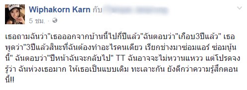 "เธอถามฉันว่า "เธอออกจากบ้านนี้ไปกี่ปีแล้ว" ฉันตอบว่า "เกือบ 3 ปีแล้ว" เธอพูดว่า "3 ปีแล้วสินะที่ฉันต้องทำอะไรคนเดียว เรียกช่างมาซ่อมแอร์ ซ่อมนู่นนี่" ฉันตอบว่า "ปีหน้าฉันจะกลับไป" TT ฉันอาจจะไม่หวานแหวว แต่โปรดจงรู้ว่า ฉันห่วงเธอมาก ให้เธอเป็นแบบเดิม ทะเลาะกัน ยังดีกว่าความรู้สึกตอนนี้ !!"