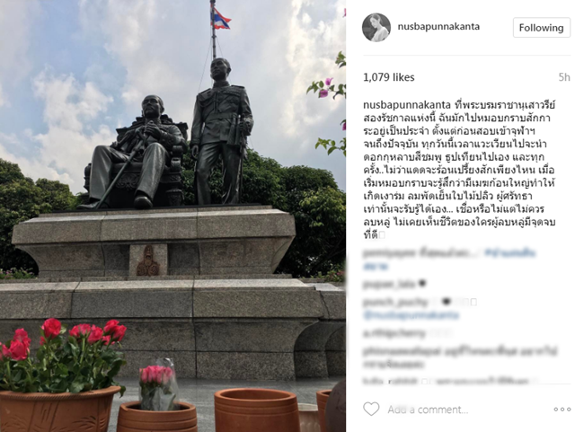 วันที่ 5 พฤษภาคม 2560 นุส นุสบา ปุณณกันต์ นักแสดงสาวชื่อดัง ศิษย์เก่าคณะอักษรศาสตร์ จุฬาลงกรณ์มหาวิทยาลัย ได้โพสต์ภาพ พระบรมราชานุสาวรีย์สมเด็จพระปิยมหาราชและสมเด็จพระมหาธีรราชเจ้า หรือ "พระบรมราชานุสาวรีย์สองรัชกาล" ที่ด้านหน้าหอประชุมจุฬาลงกรณ์มหาวิทยาลัย พร้อมข้อความว่า...