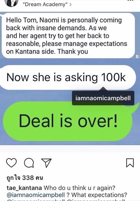 ทำเอาหลายคนงงสุด ๆ เมื่อล่าสุด (7 พฤษภาคม 2560) เต้ กันตนา ผู้ผลิต The Face Thailand ได้โพสต์ข้อความคุยแชทไลน์กับใครสักคนพูดคุยถึงข้อตกลงและเรียกร้องเงินจำนวนหนึ่ง ซึ่งมีการแท็กชื่อ นาโอมิ แคมป์เบล เจ้าของลิขสิทธิ์รายการ The Face ในนั้น พร้อมแคปชั่น "Who do u think u r again ?" (เธอคิดว่าเธอเป็นใคร ?) ก่อนลบภาพแชทนี้ทิ้ง
