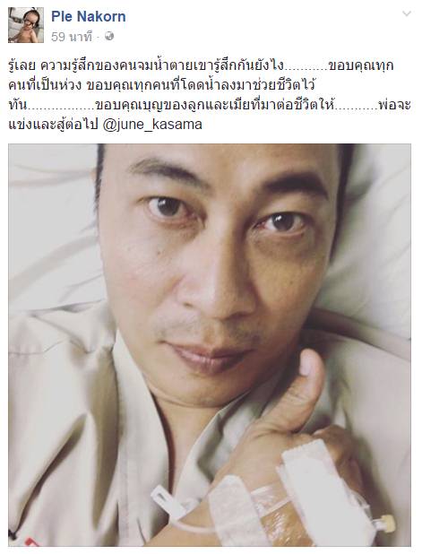 ทั้งนี้ในเฟซบุ๊กเพจ Ple nakorn ได้อัพเดทเหตุการณ์ผ่านเฟซบุ๊กไลฟ์ ฝากถึงครอบครัวว่าไม่ต้องเป็นห่วง ขณะนี้ปลอดภัยแล้ว แต่ขณะเกิดเหตุถูกเข็มขัดนิรภัยรัดจึงทำให้พยายามแกะกระชากออกจนสำลักน้ำ และตัดสินใจถีบตัวเองออกมาจากเรือ