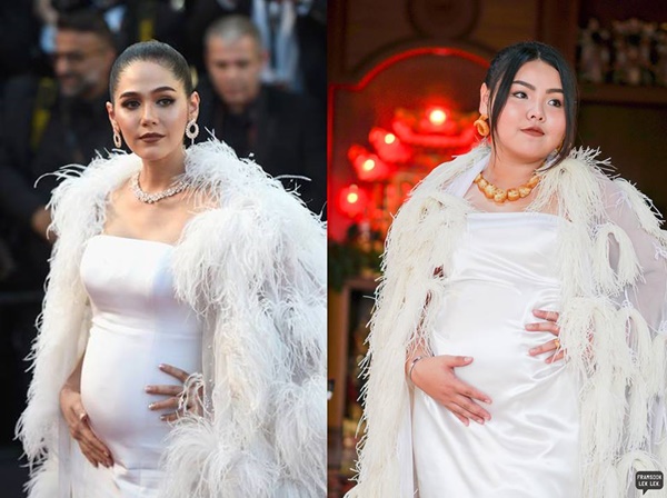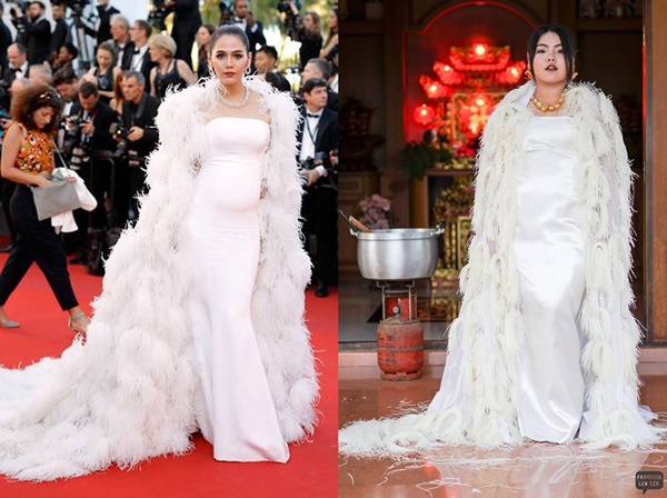 จากชุดกระโปรงผ้าไหมสีขาวทรงสอบยาวโชว์สัดส่วน จากแบรนด์ Ralph & Russo พร้อมเคปคลุมไหล่ตัวยาว ประดับขนนกและคริสตัล ของสาว ชมพู่ อารยา มาสู่ชุดคอสเพลย์สุดอลังของ น้องทราย เบญจพร ที่มาเต็มด้วยเฟอร์จากเส้นเล็กแห้ง และหม้อก๋วยเตี๋ยวพร้อมลวก กับแคปชั่น "พี่ชมท้องแฝด VS น้องทรายท้องแตก เส้นเล็กแห้งสักชามมั้ยคะพี่ชม"