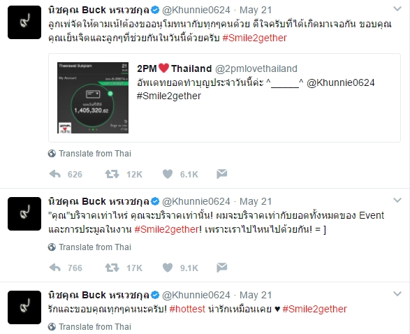 ทั้งนี้ นิชคุณ ได้ทวีตข้อความในทวิตเตอร์ขอบคุณแฟนคลับด้วยว่า "ลูกเพ่จัดให้ตามเน้ ! ต้องขออนุโมทนากับทุก ๆ คนด้วย ดีใจครับที่ได้เกิดมาเจอกัน ขอบคุณ คุณเย็นจิตและลูก ๆ ที่ช่วยกันในวันนี้ด้วยครับ"