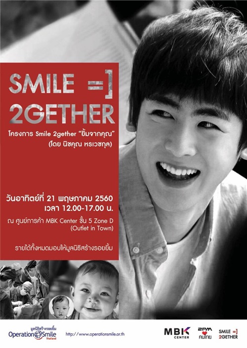ถึงแม้ว่าจะมีงานที่ต่างประเทศต้องบินไปบินมาอยู่ตลอด แต่ซุปตาร์หนุ่ม นิชคุณ หรเวชกุล หรือ นิชคุณ 2PM ก็ยังหาโอกาสจัดทำบุญร่วมกับแฟนคลับในโครงการ Smile 2gether ยิ้มจากคุณ ซึ่งมีการจัดประมูลของเพื่อมอบรายได้ให้กับมูลนิธิสร้างรอยยิ้ม ศัลยกรรมภาวะปากแหว่งเพดานโหว่และความผิดปกติบนใบหน้าแก่เด็ก ๆ